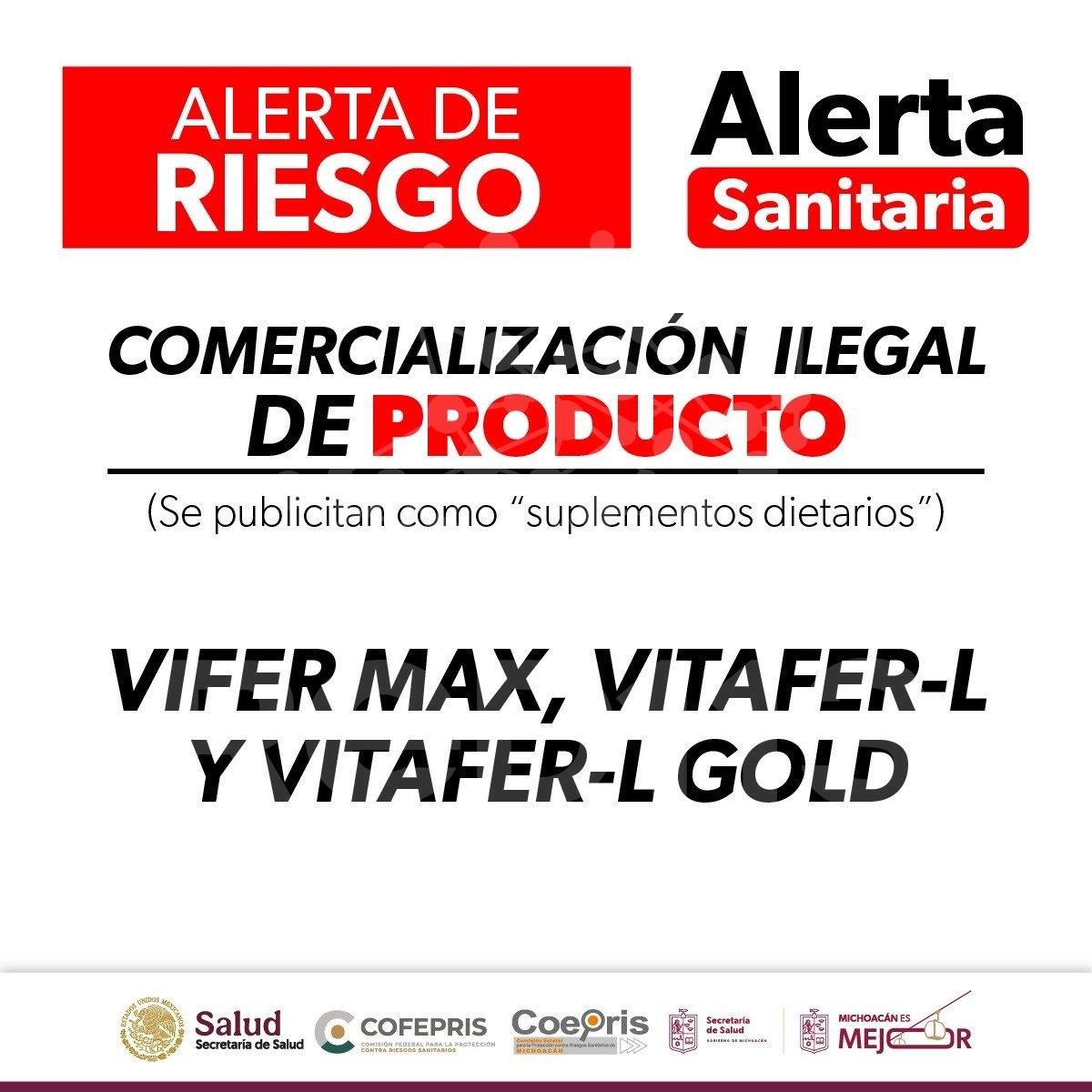 Morelia, Michoacán, 12 de marzo de 2026.- La Comisión Federal para la Protección contra Riesgos Sanitarios (Cofepris), a través de la Secretaría de Salud de Michoacán (SSM), informa a la población sobre la comercialización ilegal de los productos VIFER MAX, VITAFER-L y VITAFER-L GOLD, los cuales se promocionan como “suplementos dietarios” y se venden principalmente en plataformas de comercio electrónico, sitios web y aplicaciones móviles.
