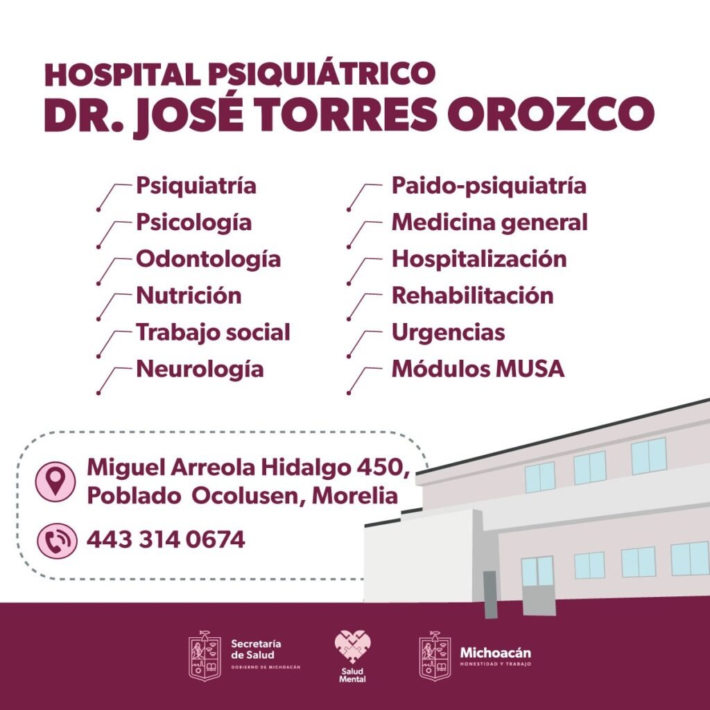 Ante tal situación, la Secretaría de Salud de Michoacán (SSM) exhorta a la población a atender su salud mental, acudiendo de forma gratuita a una consulta a este hospital que ofrece servicios de psicología, psiquiatría, paido psicología, neurología, nutrición, paido psiquiatría y odontología.