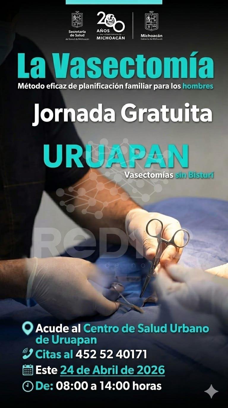 Uruapan, Mich.- Una jornada gratuita de vasectomía sin bisturí se llevará a cabo el próximo viernes 24 de abril en las instalaciones del Centro de Salud Urbano «José Álvarez Amézquita» de Uruapan.