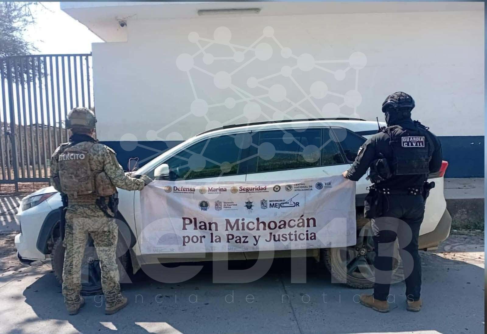 Apatzingán, Mich.- 13 de marzo de 2026.- Durante un operativo de seguridad y prevención del delito realizado por integrantes de la Base de Operaciones Interinstitucionales (B.O.I.) en la localidad de Acahuato, municipio de Apatzingán, fue asegurada una camioneta con reporte de robo en cuyo interior se localizó armamento de alto poder y municiones.