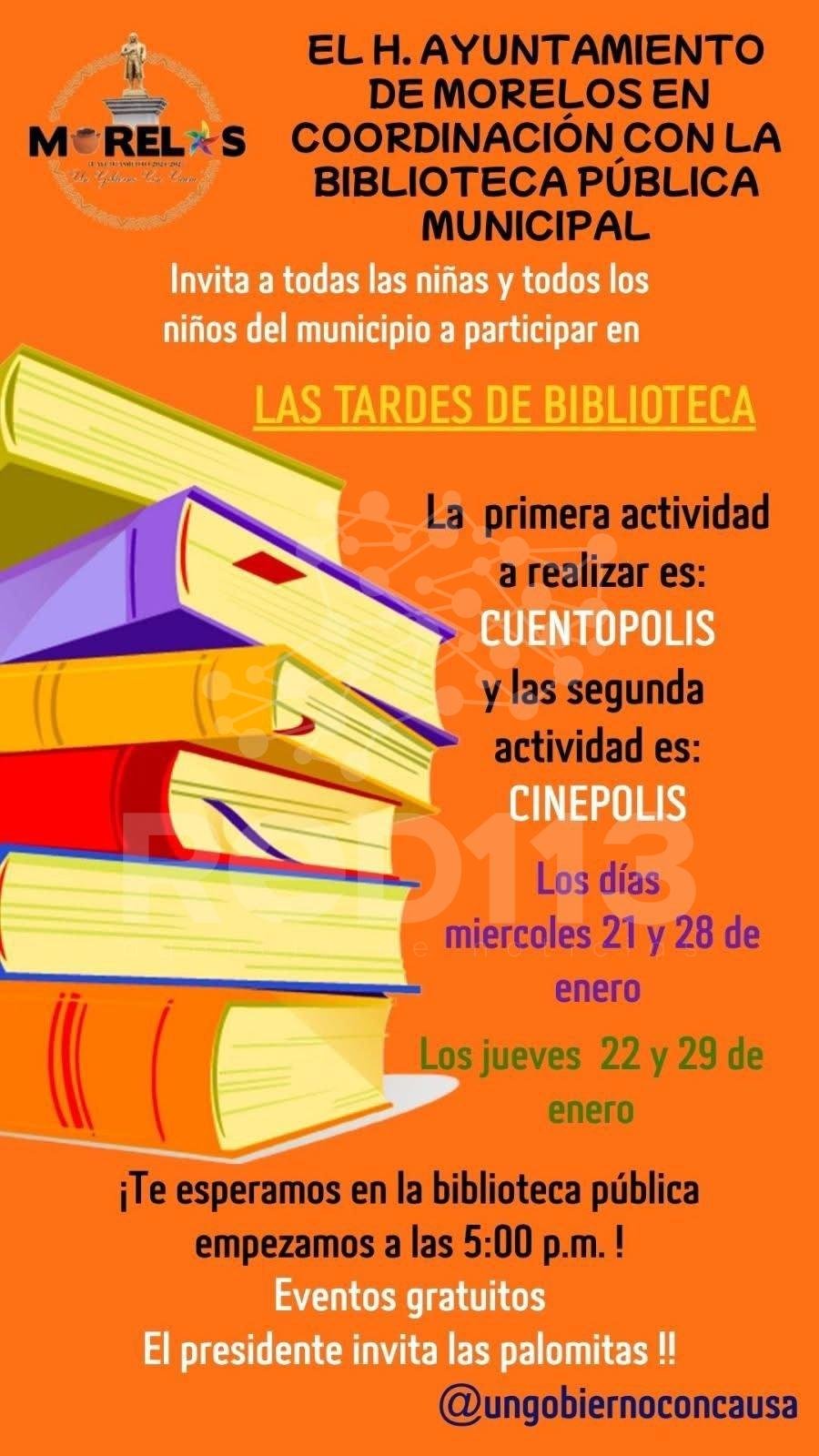 Con el objetivo de rescatar los espacios públicos y fomentar la cultura y el arte entre la niñez morelense, el Ayuntamiento de Morelos, en coordinación con los responsables de la Biblioteca Pública Municipal, convoca a niñas y niños del municipio a participar en el programa “Las Tardes de Biblioteca”, que se llevará a cabo en Villa Morelos.