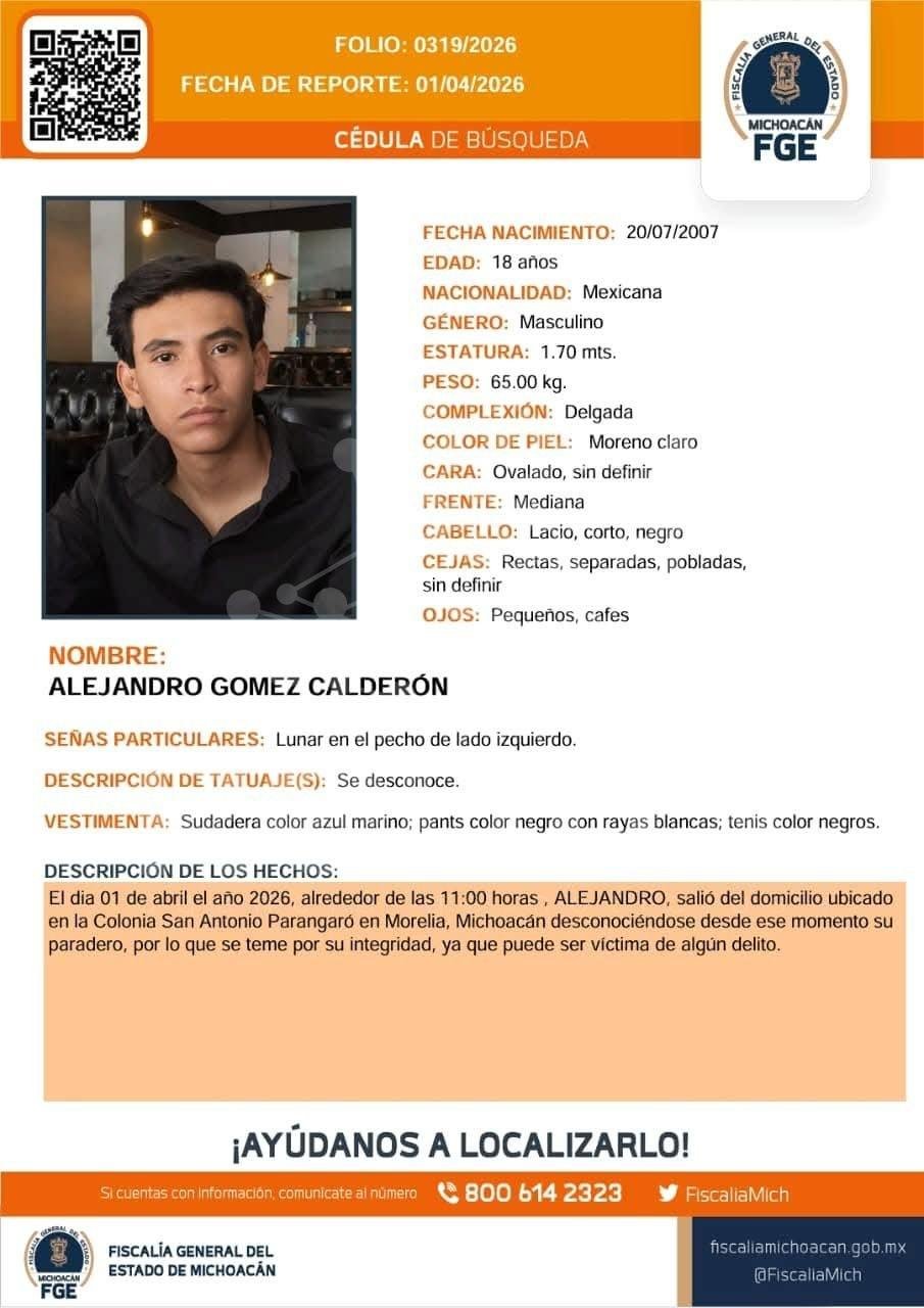 Morelia, Mich.-02 de abril de 2026.-Alejandro Gómez Calderón, de 18 años, fue reportado como desaparecido el 1 de abril de 2026 en la colonia San Antonio Parangaré, ubicada en el municipio de Morelia.