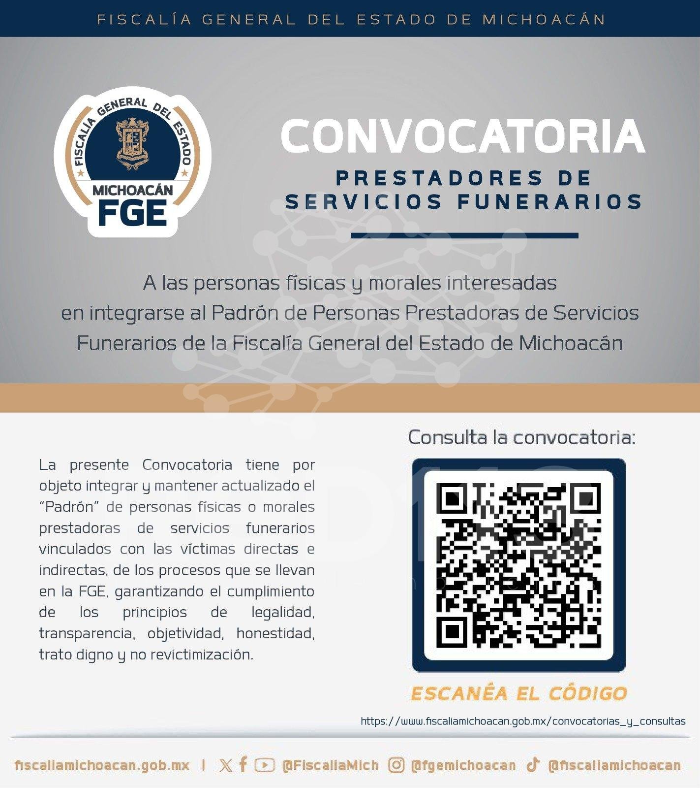 Morelia, Michoacán, a 7 de abril de 2026.- En un paso firme para fortalecer la legalidad, la transparencia y el respeto a los derechos humanos, el Fiscal General del Estado, Carlos Torres Piña, anunció la convocatoria para que personas físicas y morales se integren al Padrón de Personas Prestadoras de Servicios Funerarios de la Fiscalía General del Estado de Michoacán (FGE), instrumento clave para asegurar procesos dignos en la entrega de cadáveres o restos humanos a sus familiares.