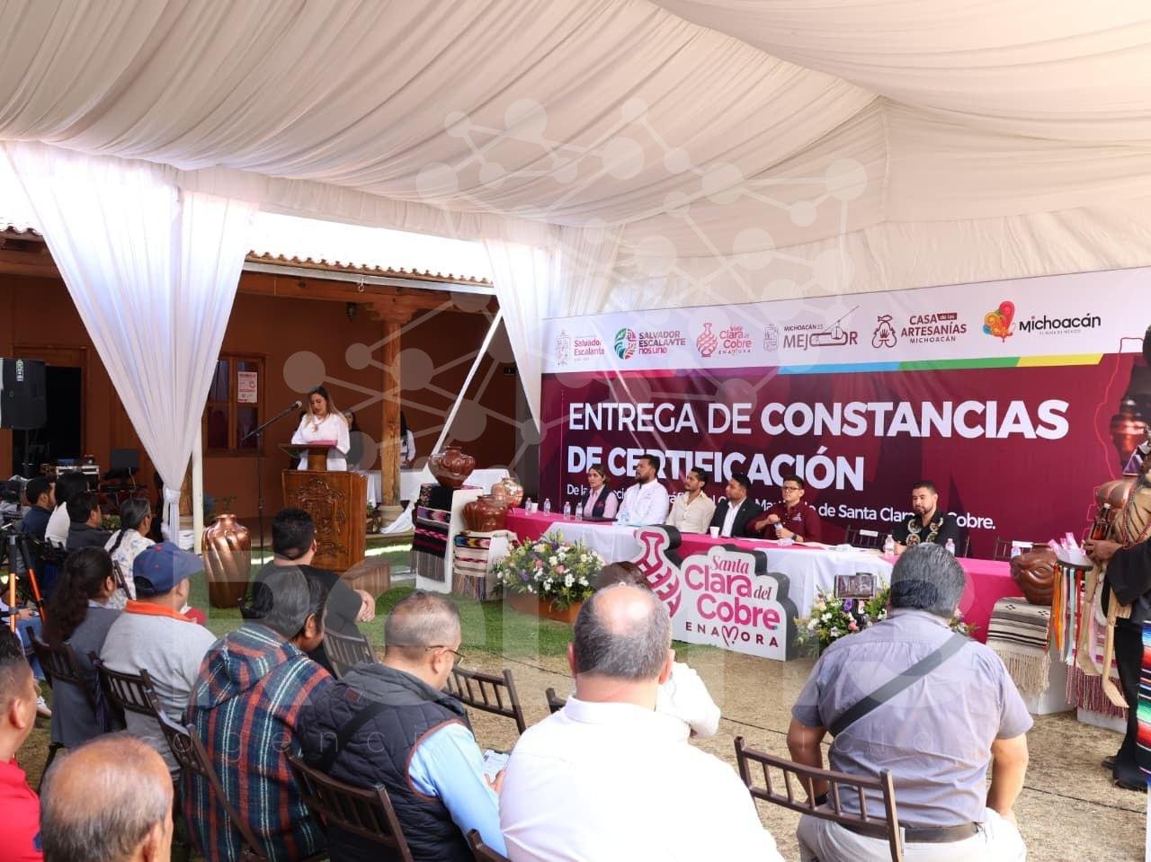 Salvador Escalante, Michoacán, 6 de marzo de 2026.- Un total de 48 personas artesanas de Santa Clara del Cobre recibieron certificaciones y etiquetas oficiales que garantizan la autenticidad, calidad y origen geográfico de sus piezas, las cuales cuentan con la Indicación Geográfica (IG), informó la Casa de las Artesanías de Michoacán (Casart).