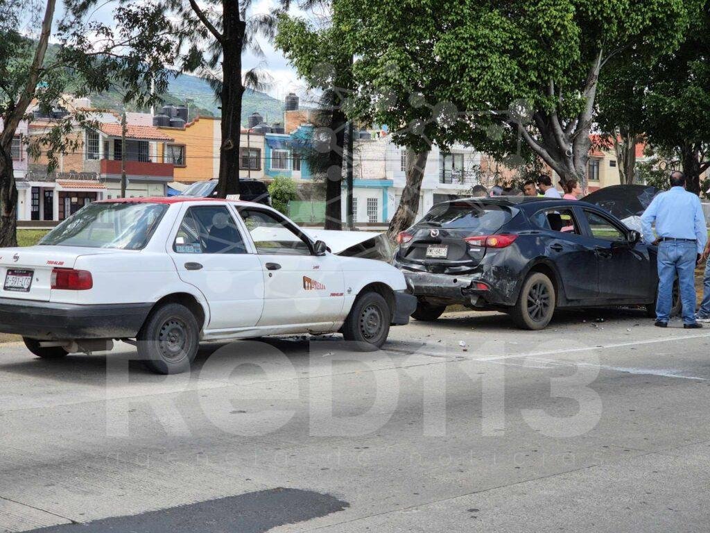 Morelia, Michoacán.- Miércoles 7 de agosto de 2024.- Un accidente vehicular involucró a un taxi, una camioneta Mazda negra y una camioneta Tundra en el Libramiento República de la ciudad, a la altura de la colonia Rafael Carrillo.