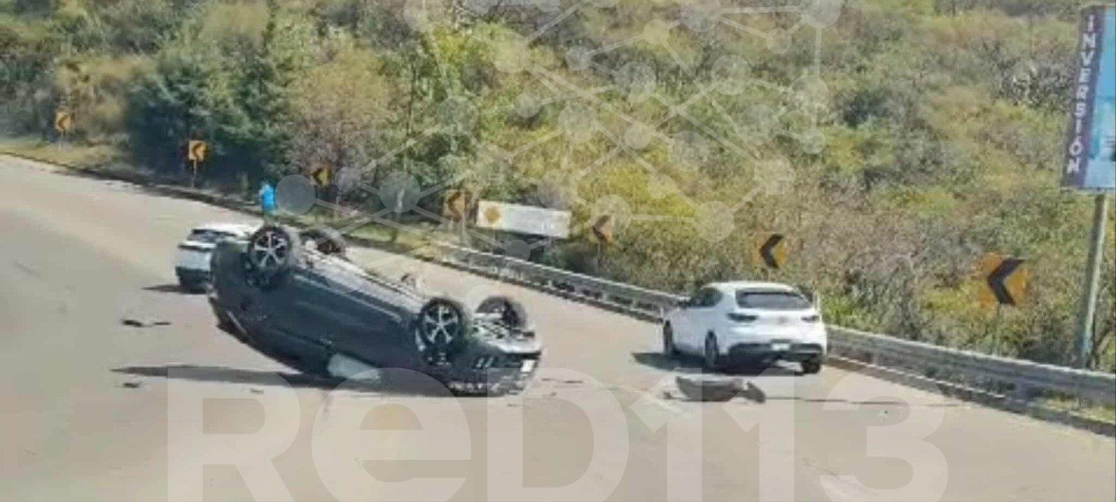 Morelia, Mich.- Domingo 26 de octubre de 2025.- Dos vehículos protagonizaron un choque en la zona de Tres Marías, al oriente de Morelia. Una de las unidades involucradas volcó, informaron autoridades policiales.