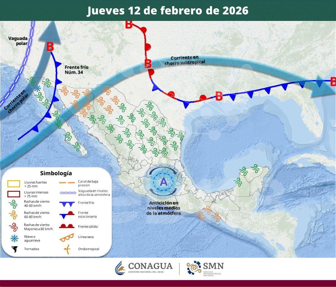 Para este jueves, el desplazamiento del Frente Frío número 34 y una vaguada polar sobre el noroeste del territorio nacional, en interacción con las corrientes en chorro polar y subtropical, generarán un descenso térmico considerable, vientos fuertes y potencial de caída de nieve o aguanieve. Ante estas condiciones, la Coordinación Nacional de Protección Civil (CNPC), de la Secretaria de Seguridad y Protección Ciudadana (SSPC), emite las siguientes recomendaciones proactivas para salvaguardar la integridad de la población en dichas zonas.