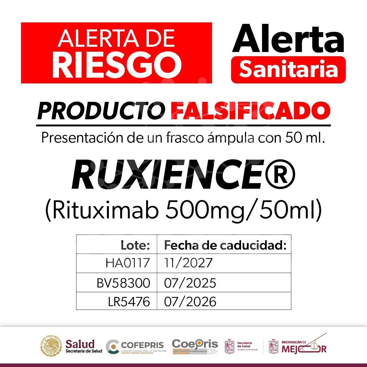 Morelia, Michoacán, 9 de febrero del 2026.- La Comisión Federal para la Protección contra Riesgos Sanitarios (Cofepris), a través de la Secretaría de Salud de Michoacán (SSM), informa a la población sobre la falsificación del medicamento Ruxience®️ (Rituximab) 500 mg/50 mL, solución inyectable, en presentación de caja con un frasco ámpula con 50 mL.
