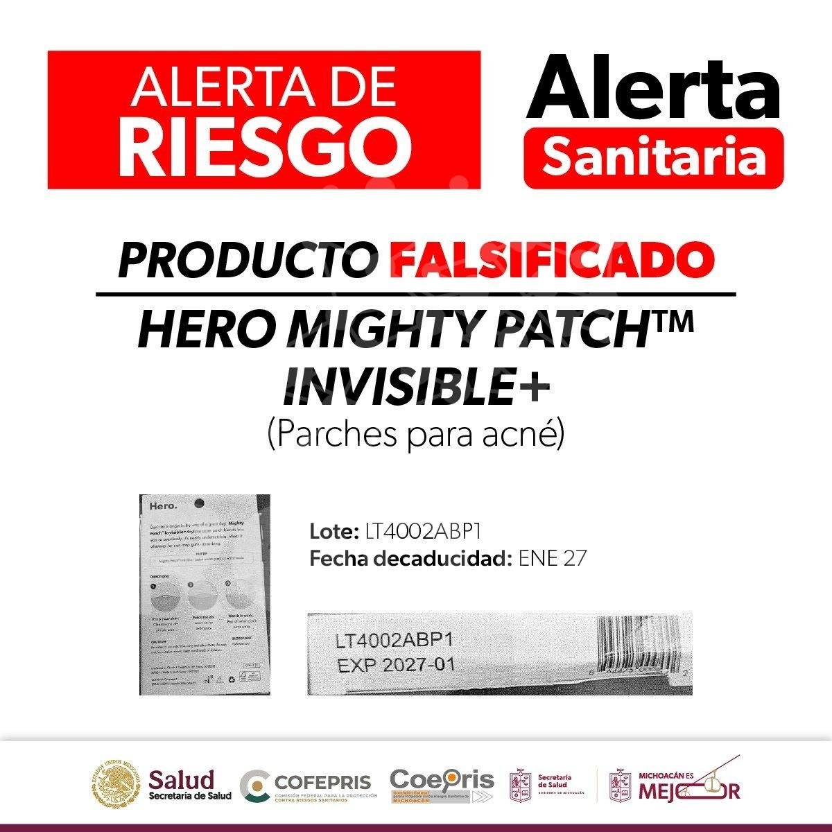 Morelia, Michoacán, 27 de enero de 2026.- La Comisión Federal para la Protección contra Riesgos Sanitarios (Cofepris), a través de la Secretaría de Salud de Michoacán (SSM), informa a la población sobre la alerta sanitaria por la comercialización ilegal del producto Hero MIGHTY PATCH™️ Invisible+ (Parches para acné), en su presentación de 39 parches en caja de cartón, el cual no cumple con la normatividad sanitaria vigente y representa un riesgo para la salud.