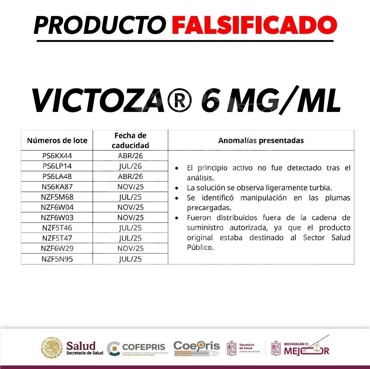 Morelia, Michoacán, 18 de marzo de 2026.- La Comisión Federal para la Protección contra Riesgos Sanitarios (Cofepris), a través de la Secretaría de Salud de Michoacán (SSM), informa a la población sobre la alerta sanitaria emitida respecto a la falsificación del medicamento Victoza®️ 6 mg/mL (Liraglutida), solución inyectable en pluma precargada, usado para mejorar el control glucémico.
