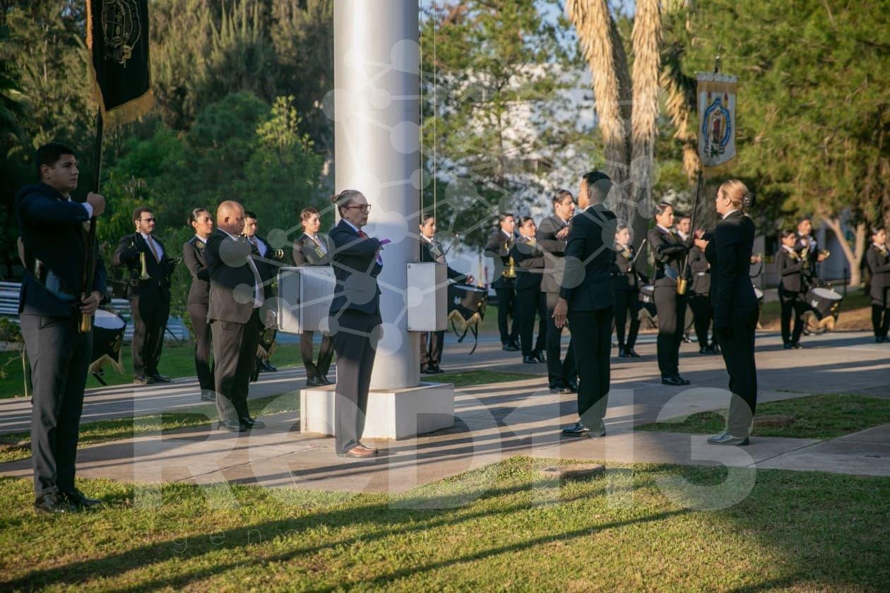 Flanqueada por integrantes del Gabinete Legal y Ampliado, la rectora nicolaita izó el lábaro patrio en la Plaza Nicolaita de Arte y Cultura, con la presencia de la Banda de Guerra, que con orgullo entonó la marcha “Crisol de Pensadoras y Pensadores”.