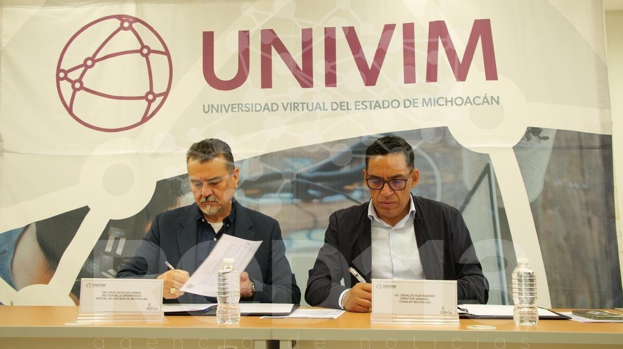 Morelia, Michoacán, 20 de febrero de 2025.- Con la finalidad de fortalecer la formación docente, el Colegio de Educación Profesional Técnica del Estado de Michoacán (Conalep), signó convenio de colaboración con la Universidad Virtual del Estado de Michoacán (Univim).