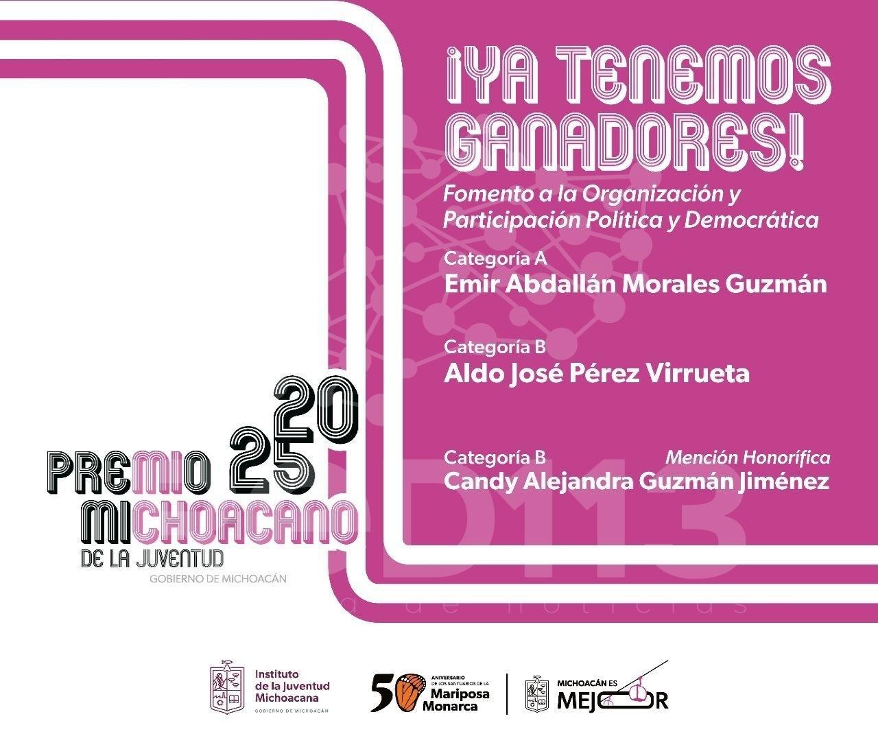 Morelia, Michoacán, 23 de octubre de 2025.- El Instituto de la Juventud Michoacana (Ijumich), dio a conocer de manera oficial la lista de las y los jóvenes galardonados con el Premio Michoacano de la Juventud en su edición 2025.