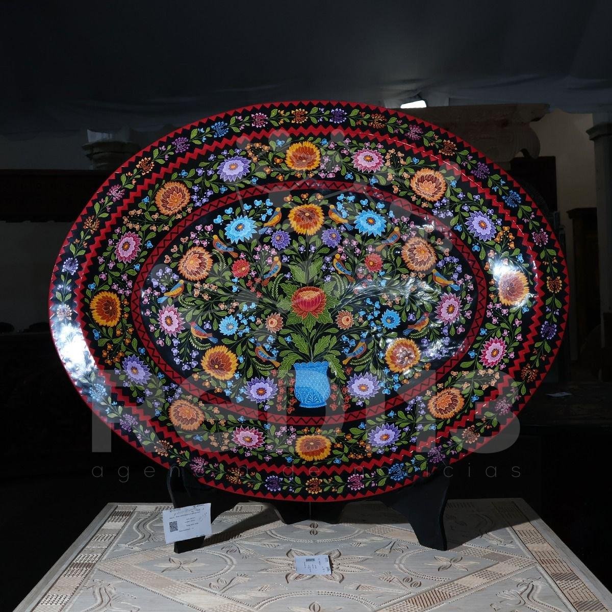 El maestro artesano Juan Valencia Villalobos, de Uruapan, obtuvo el galardón “Arturo Olivares Gallaga”, en la rama de maque, con una batea ovalada con diseño de ramo de flores antiguas que elaboró durante 12 meses principalmente con aceites y pigmentos naturales.