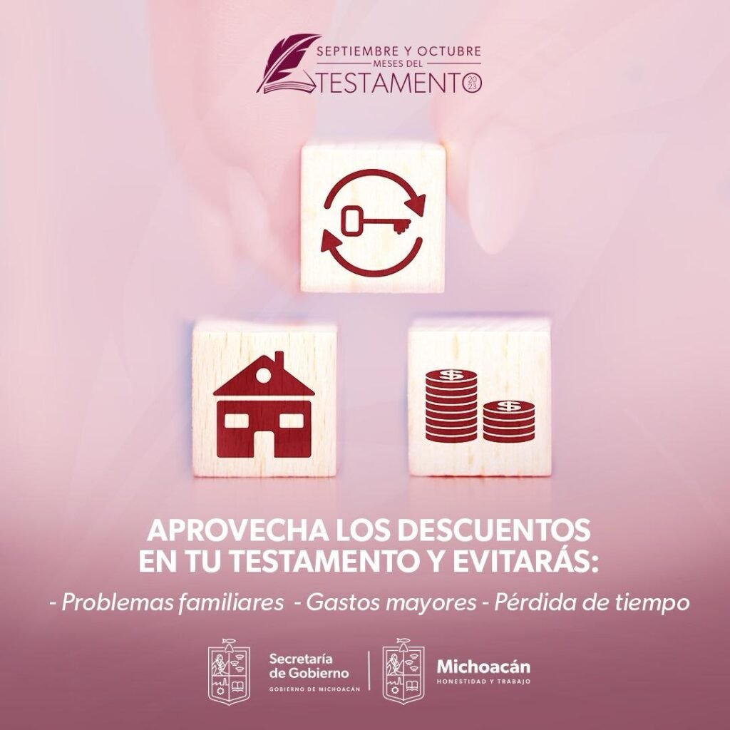 “Invitamos a las y a los michoacanos a aprovechar los descuentos ofertados por el Colegio de Notarios de Michoacán por concepto de trámites testamentarios, que se aplican desde el primer día de septiembre y que continuarán hasta el último día de octubre”, apuntó.