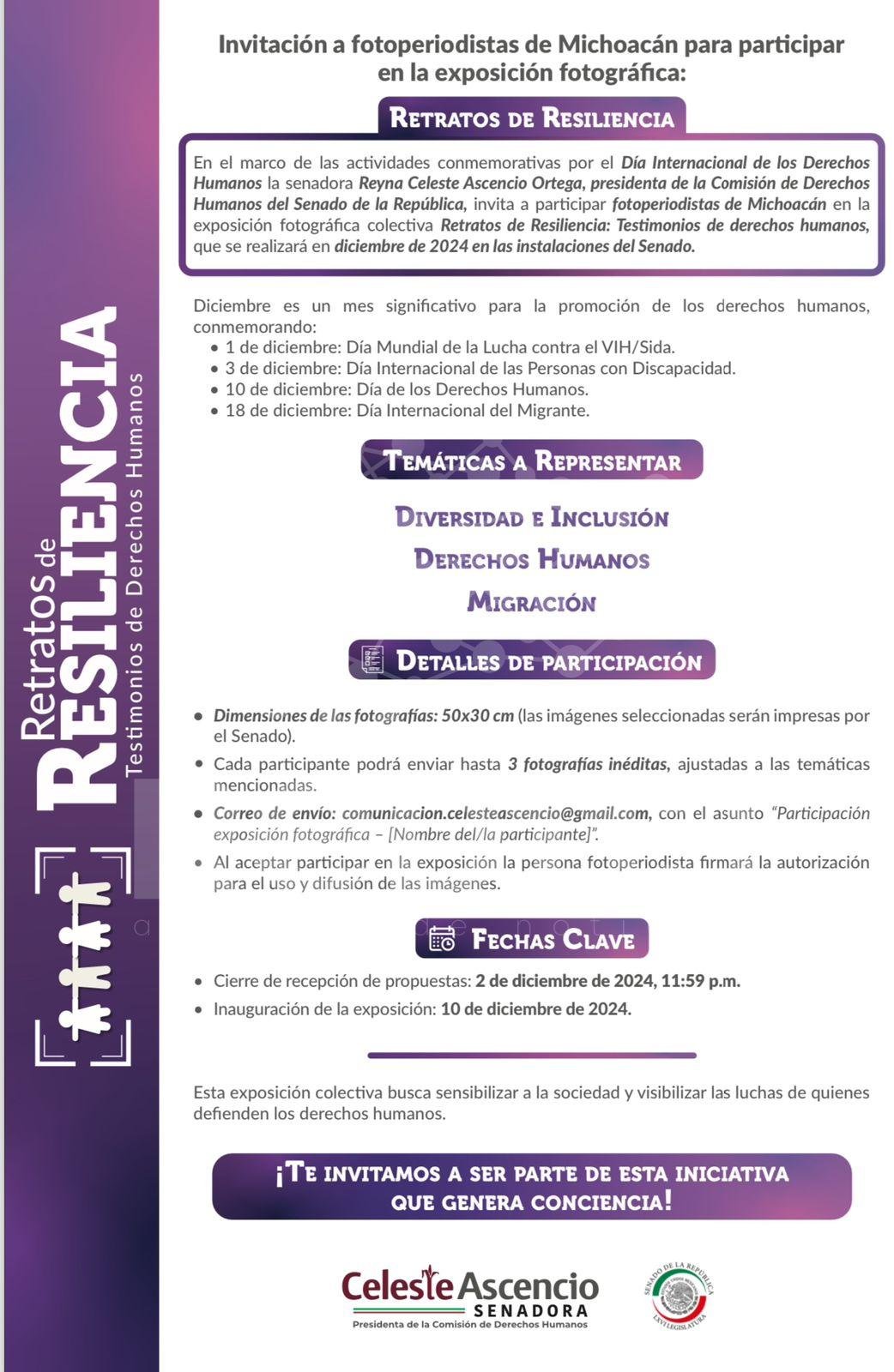 _Ciudad de México, a 27 de noviembre de 2024._ La senadora Reyna Celeste Ascencio Ortega, presidenta de la Comisión de Derechos Humanos del Senado de la República, lanzó una convocatoria a fotoperiodistas de Michoacán para participar en la exposición fotográfica colectiva «Retratos de Resiliencia: Testimonios de Derechos Humanos».