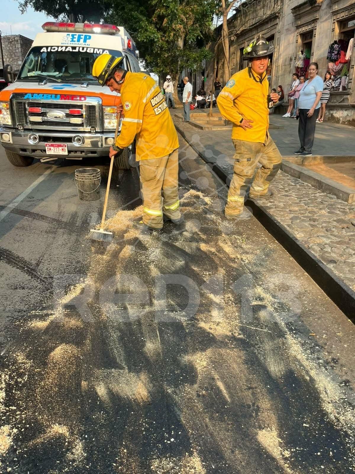 Asimismo, bomberos de la Coordinación Estatal de Protección Civil Michoacán (CEPCM) apoyaron en las labores de auxilio y esparcieron tierra sobre el asfalto para absorber el aceite y disminuir el riesgo de otro percance.