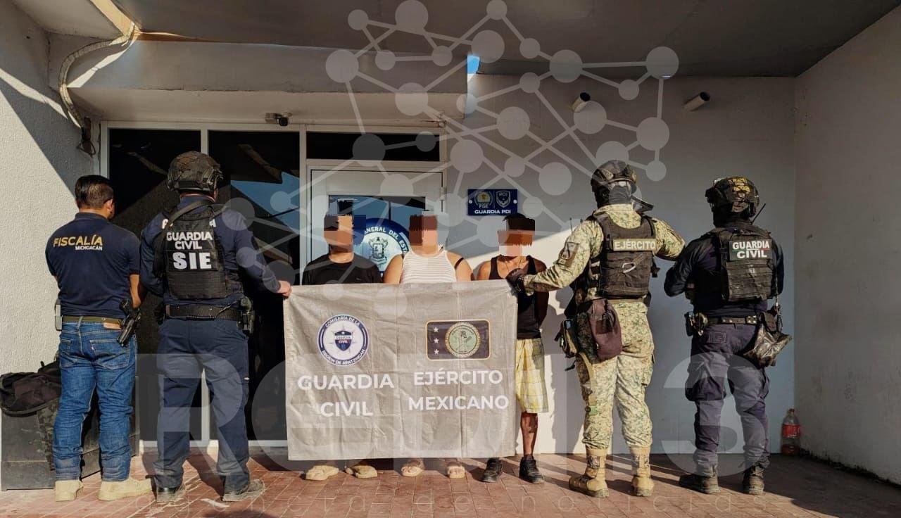 Apatzingán, Mich.- 24 de octubre de 2025.- Agentes de las secretarías de Seguridad Pública (SSP) y de la Defensa Nacional (Defensa), junto con la Fiscalía General del Estado (FGE), detuvieron en el municipio de Apatzingán a tres presuntos extorsionadores en posesión de diversas dosis de droga y una motocicleta con alteraciones en sus medios de identificación.