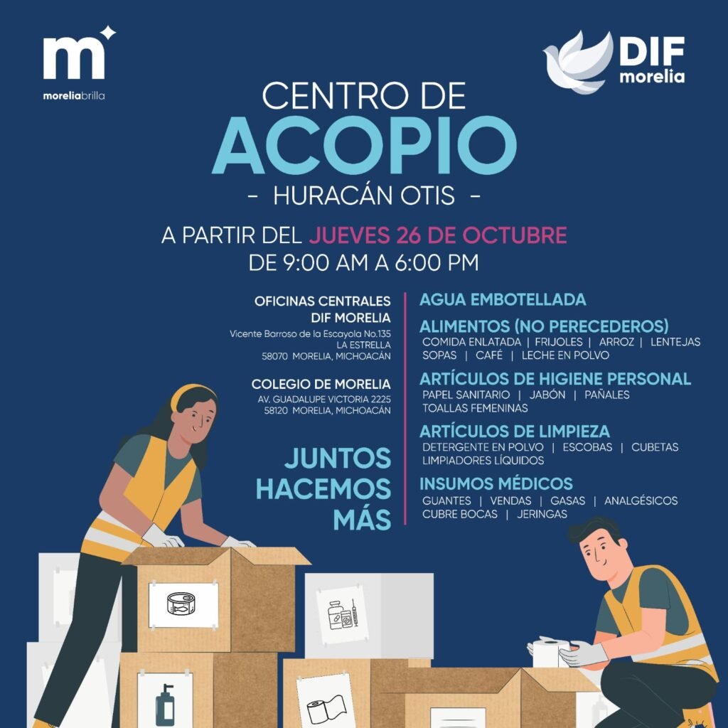 Morelia, Michoacán; 26 de octubre de 2023.- En apoyo a las y los damnificados por el paso del Huracán Otis, el DIF de Morelia llama a las y los morelianos a donar víveres y artículos diversos a través de los módulos que habilitará el Gobierno Municipal, para recolectarlos y entregarlos a los habitantes de Acapulco.