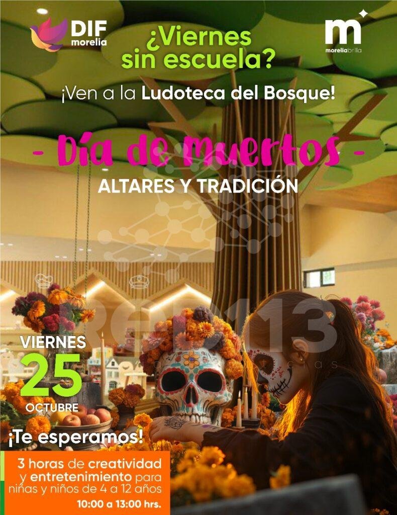 Morelia, Michoacán; 22 de octubre de 2024. – Con motivo del próximo Viernes de Consejo Técnico Escolar, el DIF Morelia que encabeza su Presidenta Honoraria, Paola Delgadillo Hernández, invita a todas las familias a inscribir a sus hijas e hijos en el taller especial de Día de Muertos que se llevará a cabo este 25 de octubre en la Ludoteca del Bosque Cuauhtémoc.