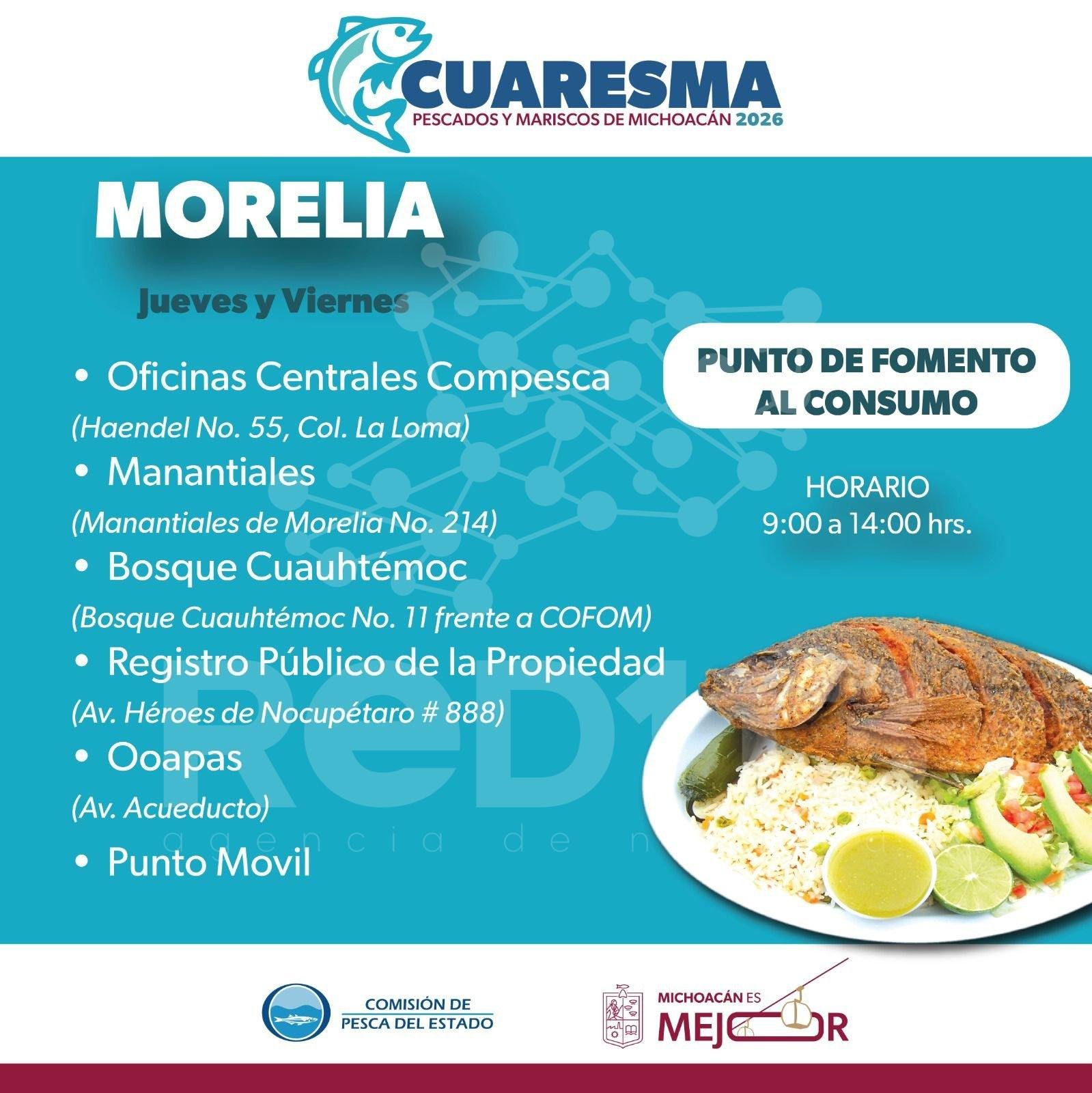 El director general de la Compesca, Ramón Hernández Orozco, informó que en Morelia se instalarán puntos de fomento al consumo los jueves y viernes de 9:00 a 14:00 horas en Manantiales, OOAPAS, Bosque Cuauhtémoc, Registro Público de la Propiedad y un punto móvil que recorrerá oficinas de gobierno. Además, de lunes a viernes habrá venta en las oficinas de la dependencia, ubicadas en calle Haendel número 55, colonia La Loma, en el mismo horario.
