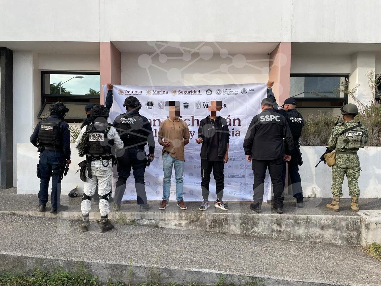 Uruapan, Michoacán, 14 de enero de 2026.- Resultado de las acciones del Plan Paricutín en la ciudad de Uruapan, elementos de las secretarías de Seguridad Pública (SSP), de la Defensa Nacional (Defensa), y de Seguridad Pública y Protección Ciudadana (SSPC) detuvieron a dos hombres en posesión de 11 envoltorios con droga.