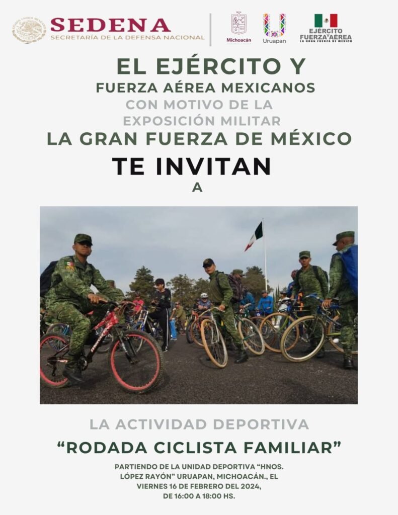 Uruapan, Mich., a 10 febrero 2024.- La Secretaría de la Defensa Nacional a través de la Exposición Militar “La Gran Fuerza de México” te invita a participar en la Rodada Ciclista Familiar que se llevará a cabo el viernes 16 de febrero 2024, esta actividad busca fomentar el deporte, una vida saludable y promover la cercanía entre la sociedad civil y las Fuerzas Armadas.