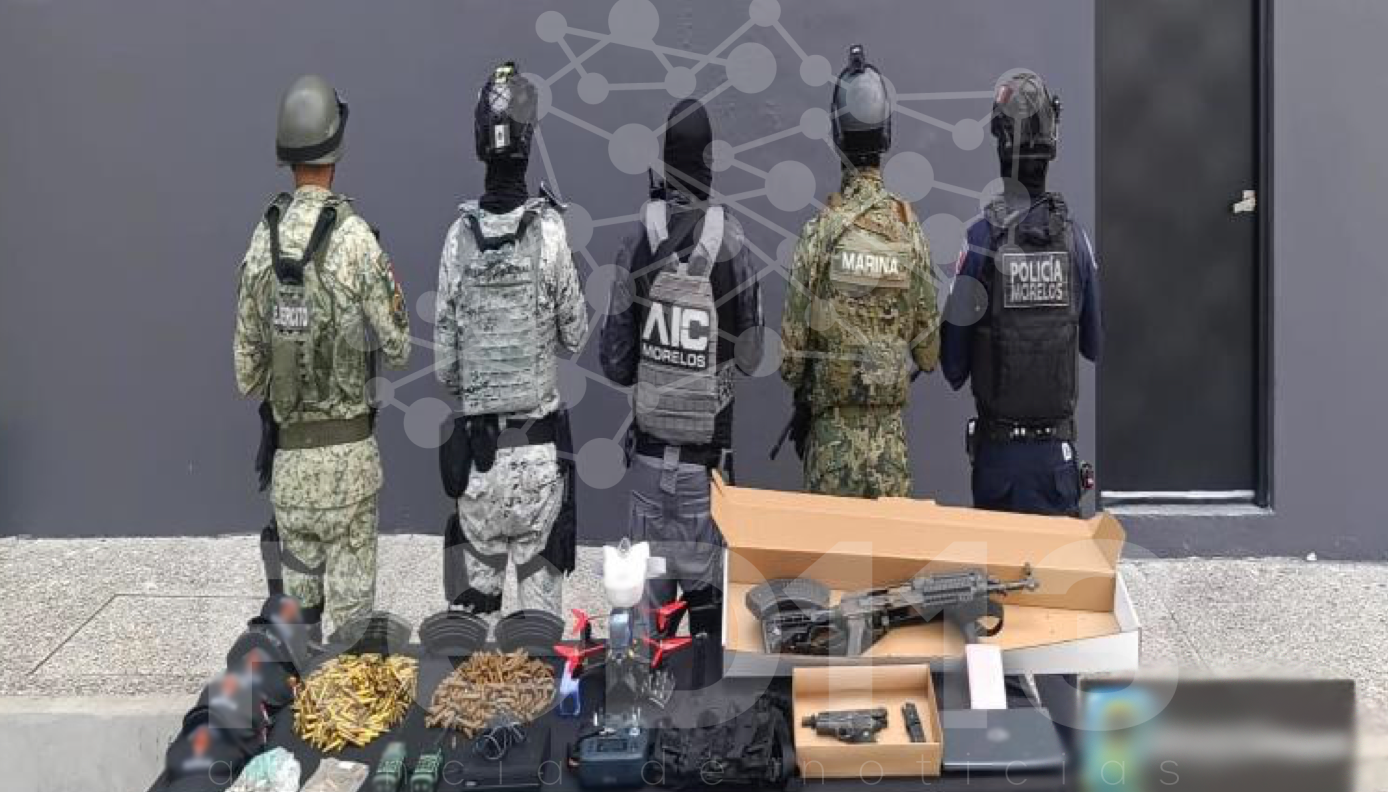 -En Jiutepec, elementos de Semar, Ejército Mexicano, GN, Fiscalía del Estado, Policía Estatal y Municipal ejecutaron una orden de cateo donde aseguraron un dron con adaptación artesanal y baterías adicionales, dos envoltorios con explosivo, un trozo de mecha incendiaria lenta, un arma larga, un arma corta, cuatro cargadores, cartuchos útiles de diversos calibres, dos radios, una laptop y tres vehículos.