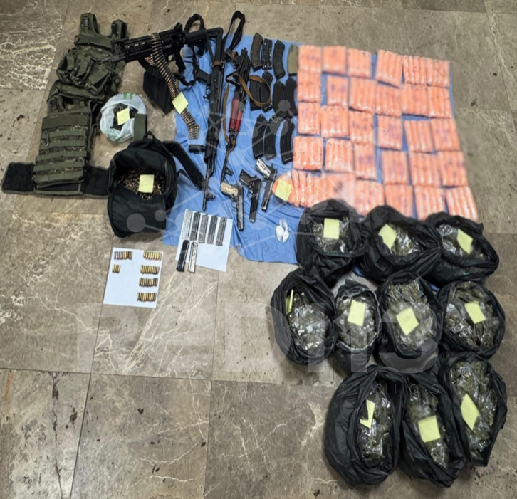 En Bácum, se detuvo a dos personas, se aseguró una ametralladora, cinco armas de fuego, 18 cargadores, 633 cartuchos, dos cintas eslabonadas para ametralladora, 6,144 dosis de metanfetamina, 991 dosis de marihuana, dosis de cocaína, dos chalecos tácticos, dos placas balísticas y dos vehículos.