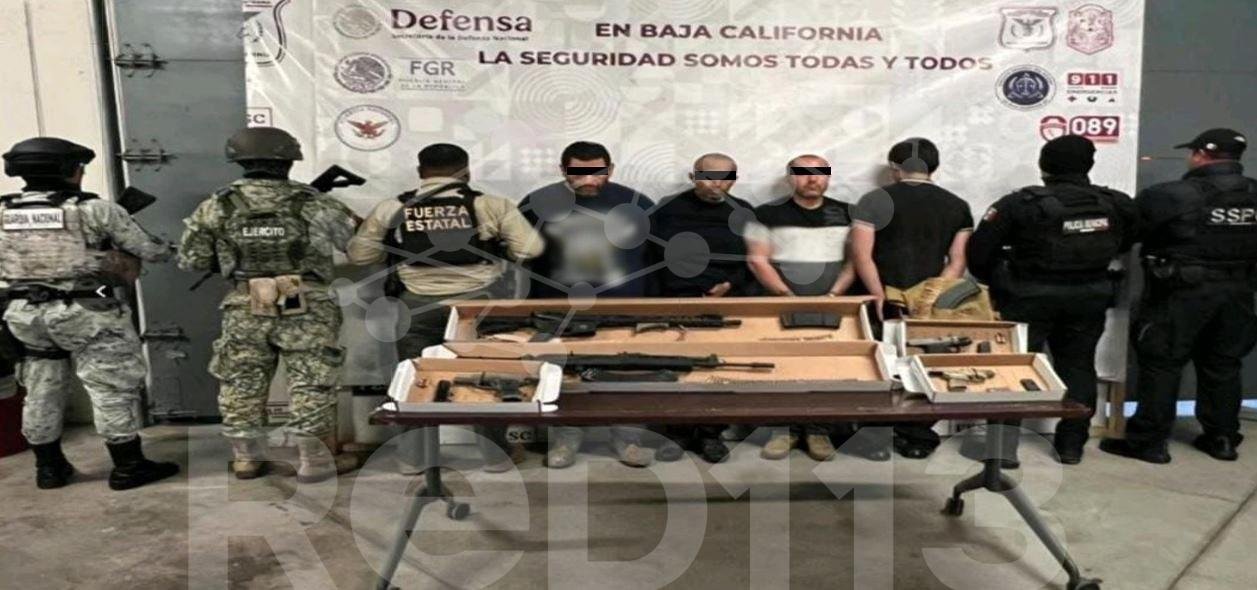 En Tijuana, se detuvo a cuatro personas, se aseguraron cinco armas de fuego, seis cargadores, 115 cartuchos y un chaleco táctico.
