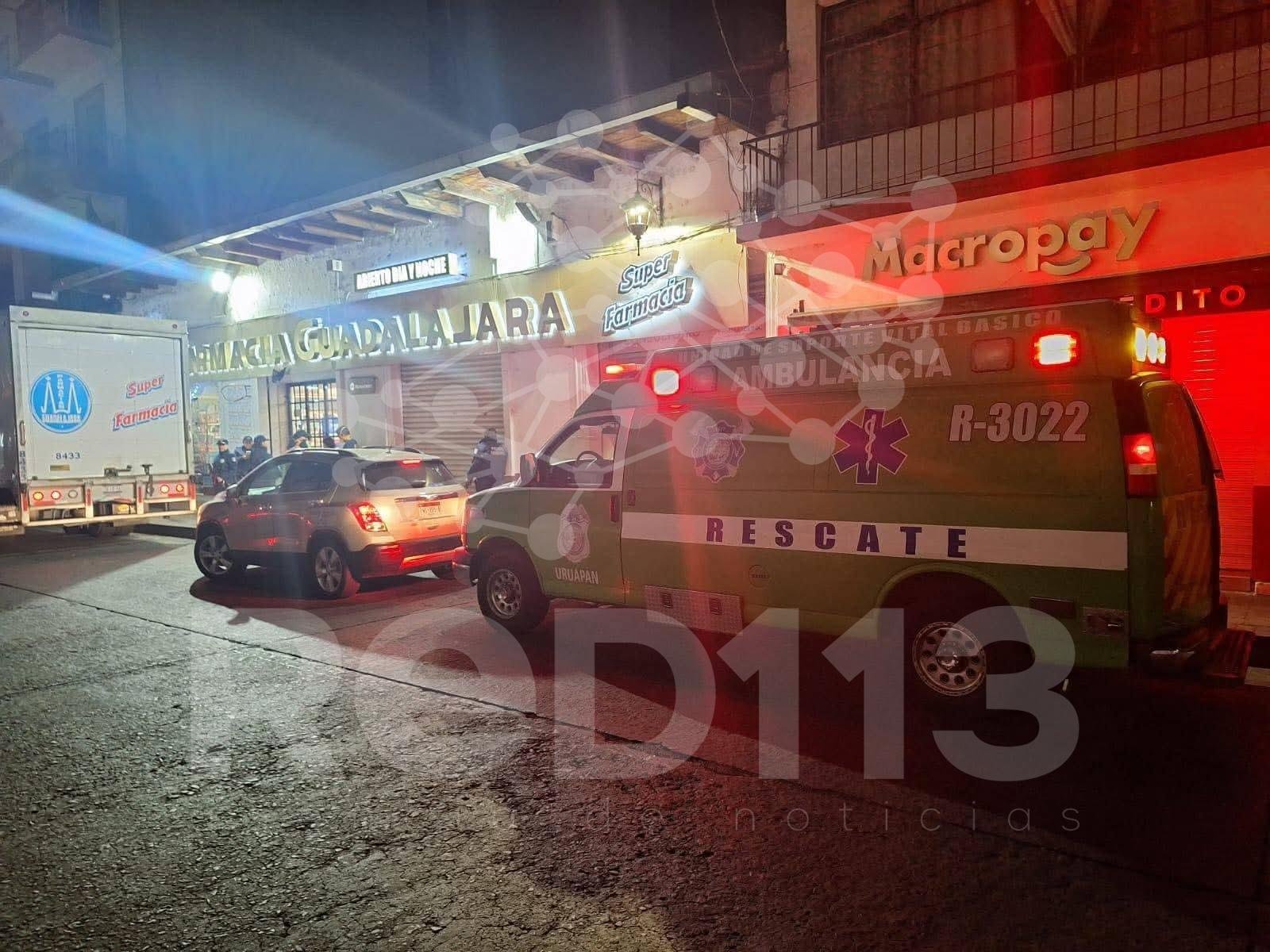 Uruapan, Mich.- 03 de marzo de 2026.- Sujetos armados asaltaron la Farmacia Guadalajara ubicada en pleno Centro de la ciudad de Uruapan, apenas a unos metros de la Casa de la Cultura donde despacha la alcaldesa Grecia Quiroz; una de las empleadas resultó con crisis nerviosa.