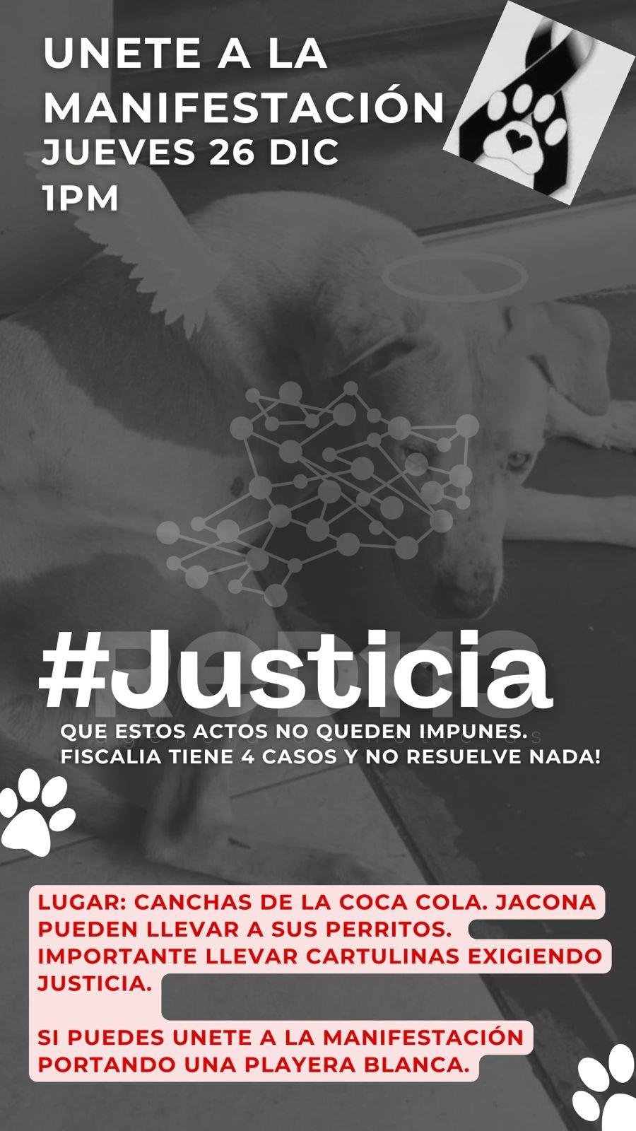 La manifestación se realizará este jueves 26 de diciembre a las 13:00 horas en las canchas de la Coca-Cola en el municipio de Jacona, invitando a la población a asistir vestida de blanco y acompañada de sus perros y de pancartas con leyendas en pro de la justicia y no más maltrato animal.