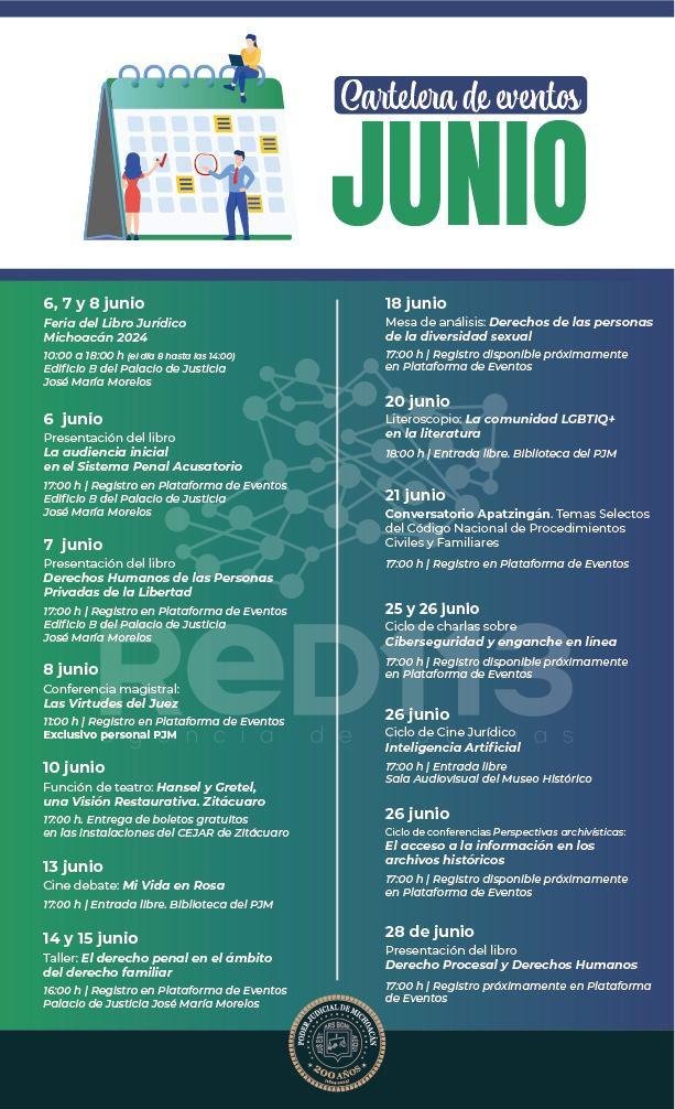 -Jueves 6 de junio. Presentación de Libro: La audiencia inicial en el Sistema Penal Acusatorio del licenciado Antonio Ríos Uriostegui. Edificio B del Palacio de Justicia José María Morelos (Calzada La Huerta #400, colonia Nueva Valladolid). 17:00 h. Registro disponible en Plataforma de Eventos https://shorturl.at/zpRxf
