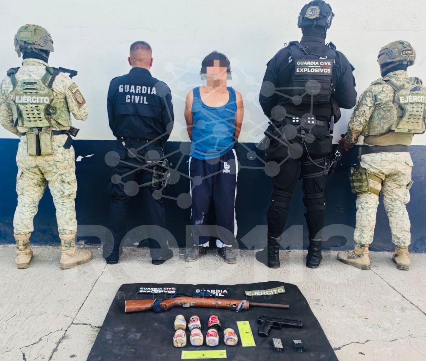Además, el ahora detenido portaba 72 cartuchos útiles y siete artefactos explosivos, por lo que el Agrupamiento Especializado en Artefactos Explosivos y Materiales Peligrosos realizó su desactivación de manera segura. El indiciado y lo decomisado, fueron puestos a disposición de la autoridad correspondiente para determinar su situación jurídica.