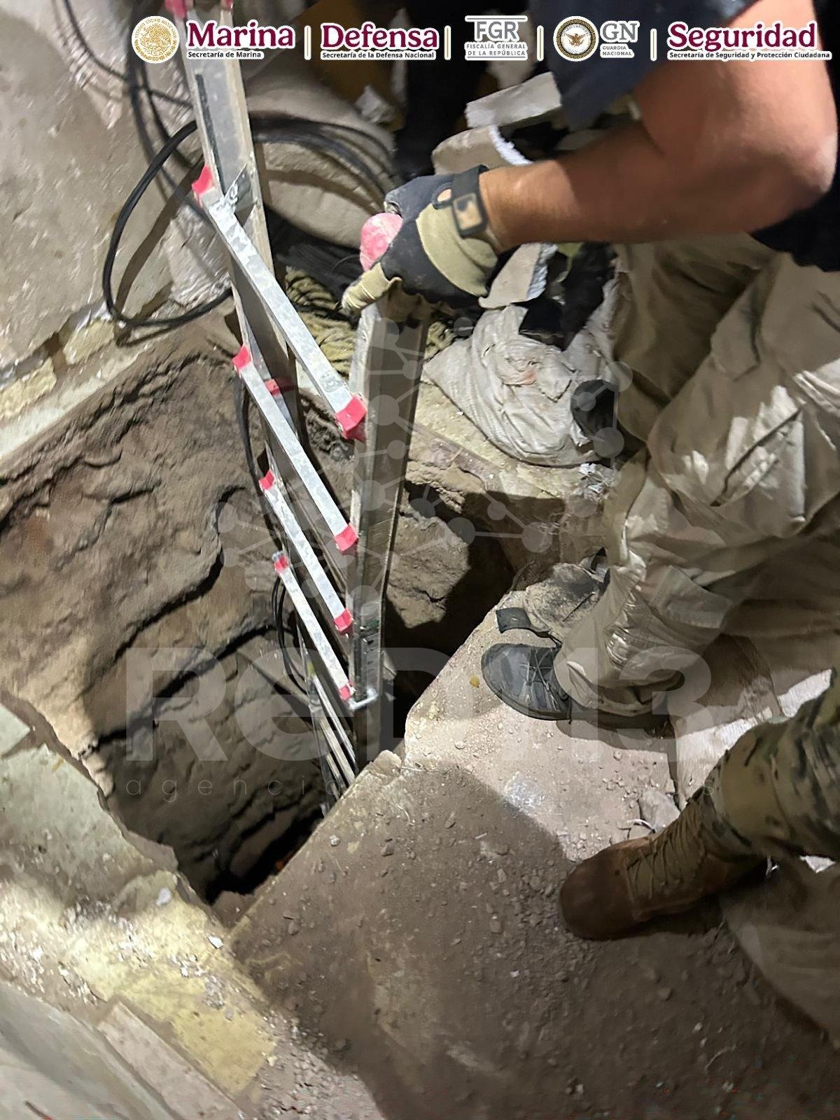Al ingresar, el personal localizó una excavación rústica con una profundidad de 4.5 metros y una longitud de 79 metros, con dirección hacia la frontera y sin salida habilitada. En el lugar fue detenida una persona, a quien se le aseguraron 21 cartuchos útiles.