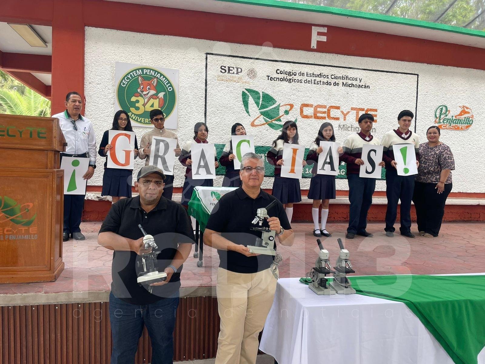 Penjamillo, Michoacán, 21 de abril de 2026.- La comunidad escolar del plantel Penjamillo del Colegio de Estudios Científicos y Tecnológicos del Estado de Michoacán (Cecytem) recibió 18 microscopios monoculares, donados por Gabriela Ivonne Cortés López, migrante originaria de la comunidad de La Noria, en el municipio de Churintzio.