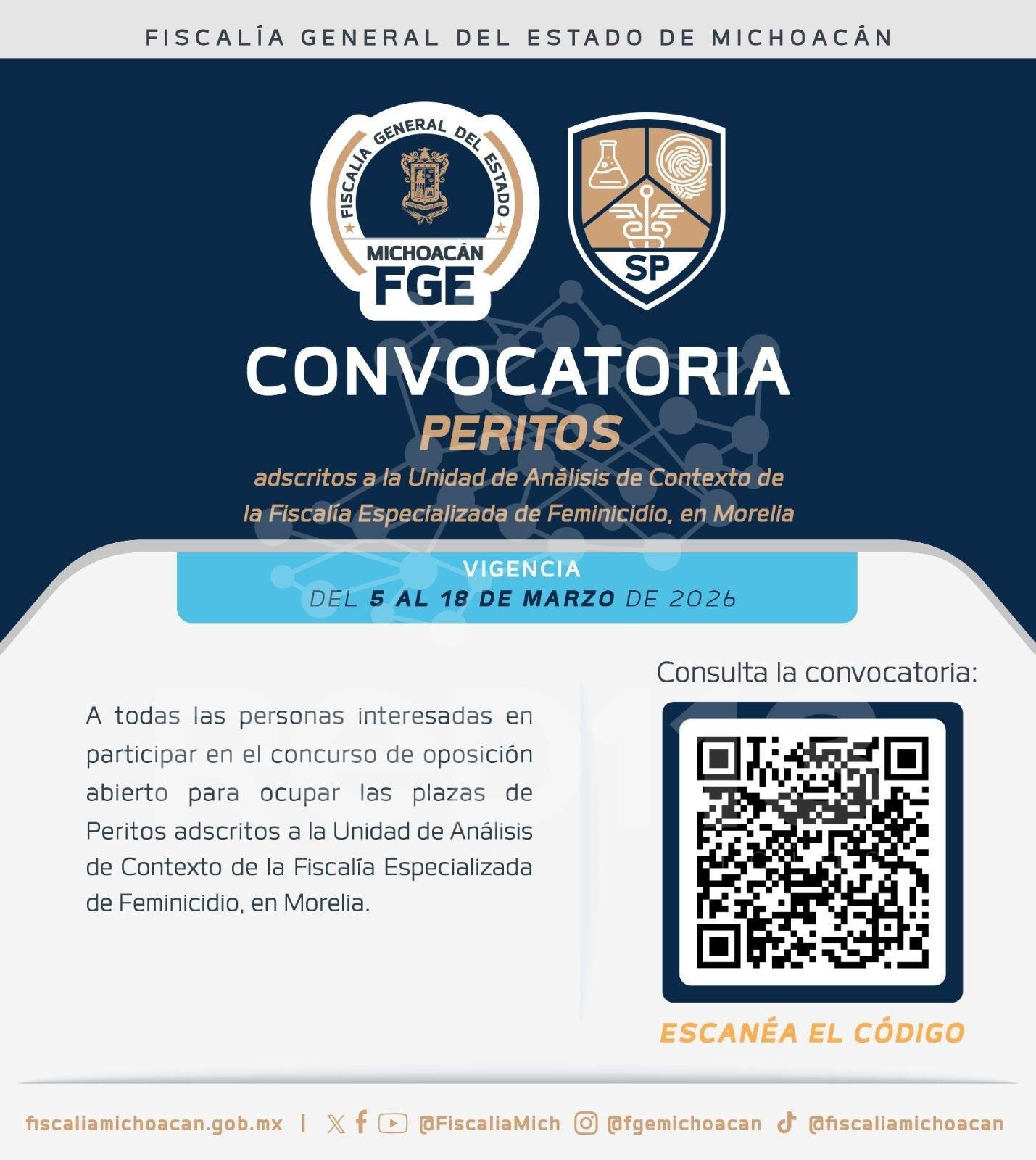 Morelia, Michoacán, a 4 de marzo de 2026.- Con el compromiso de fortalecer las investigaciones con perspectiva de género y consolidar equipos técnicos altamente especializados, la Fiscalía General del Estado de Michoacán (FGE) emitió este día la convocatoria para ocupar siete plazas de Perito, adscritas a la Unidad de Análisis de Contexto de la Fiscalía Especializada de Feminicidio.