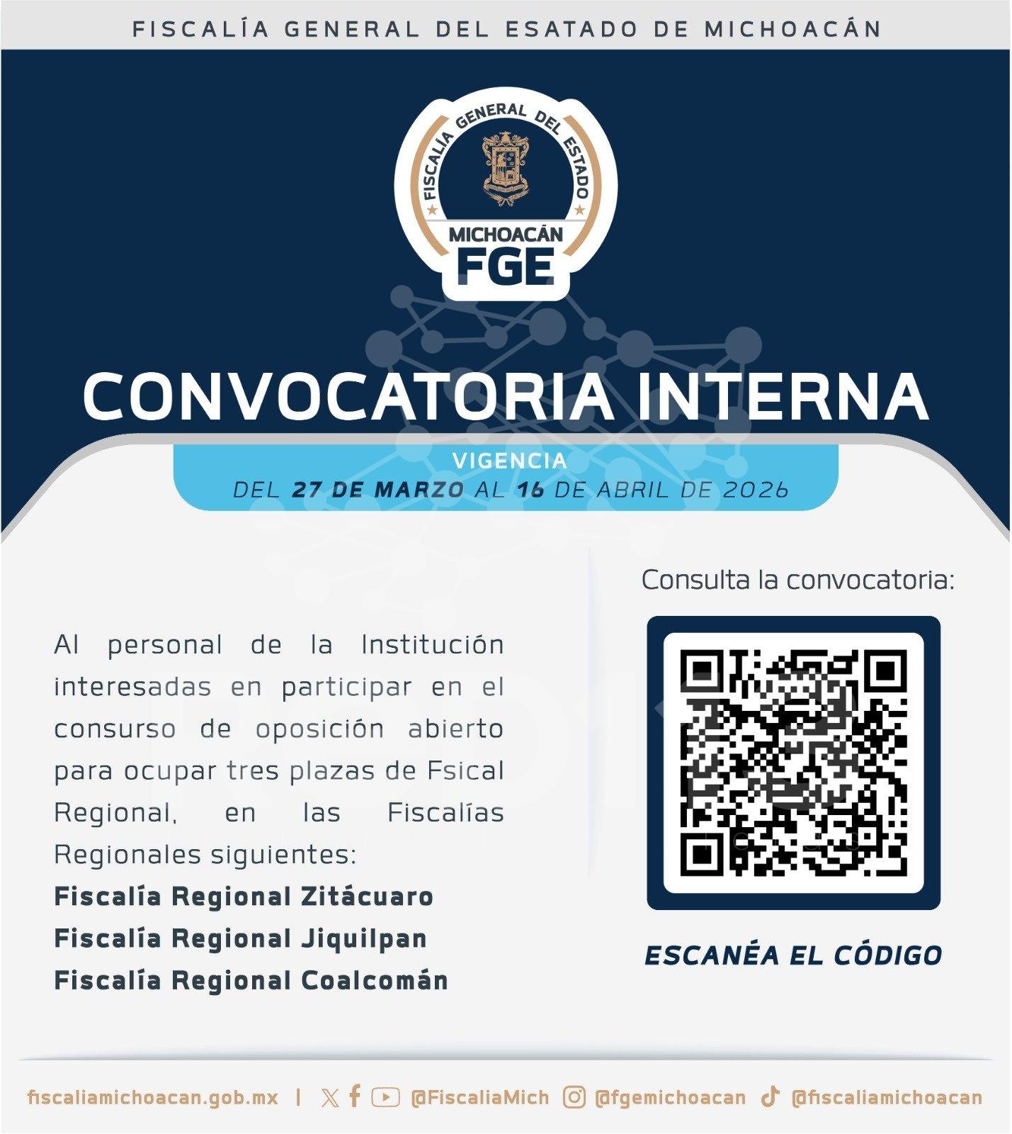Morelia, Mich.- 27 de marzo de 2026.- Con el objetivo de fortalecer la procuración de justicia y garantizar la selección de perfiles altamente capacitados, la Fiscalía General del Estado de Michoacán (FGE), encabezada por su titutal Carlos Torres Piña, emitió una convocatoria para participar en el concurso de oposición abierto para la designación de las fiscales regionales de Coalcomán, Jiquilpan y Zitácuaro.
