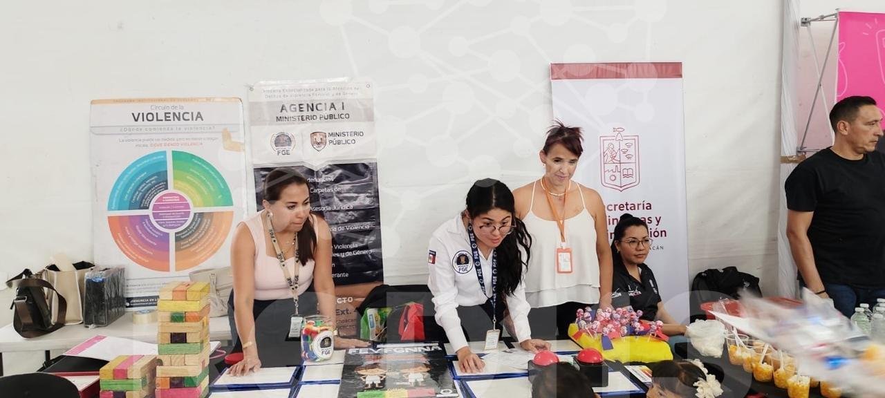 A través de la Fiscalía Especializada en Violencia Familiar, de Género y de Niñas, Niños y Adolescentes, y en atención a la invitación de la Secretaría Ejecutiva del SIPINNA Michoacán, personal especializado instaló un stand lúdico enfocado en la promoción de entornos seguros y la prevención de la violencia desde edades tempranas.
