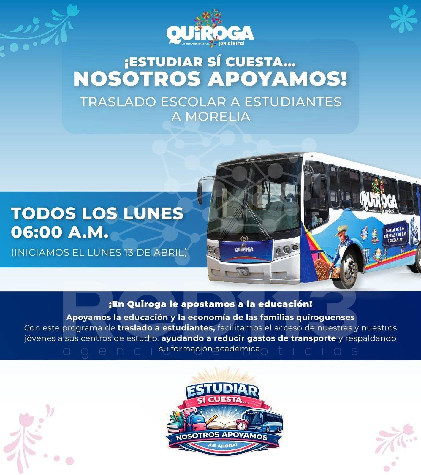 El servicio iniciará este lunes 13 de abril, con salidas todos los lunes a las 6:00 de la mañana desde la Presidencia Municipal de Quiroga, permitiendo a las y los estudiantes trasladarse de manera segura y gratuita a la capital del estado.