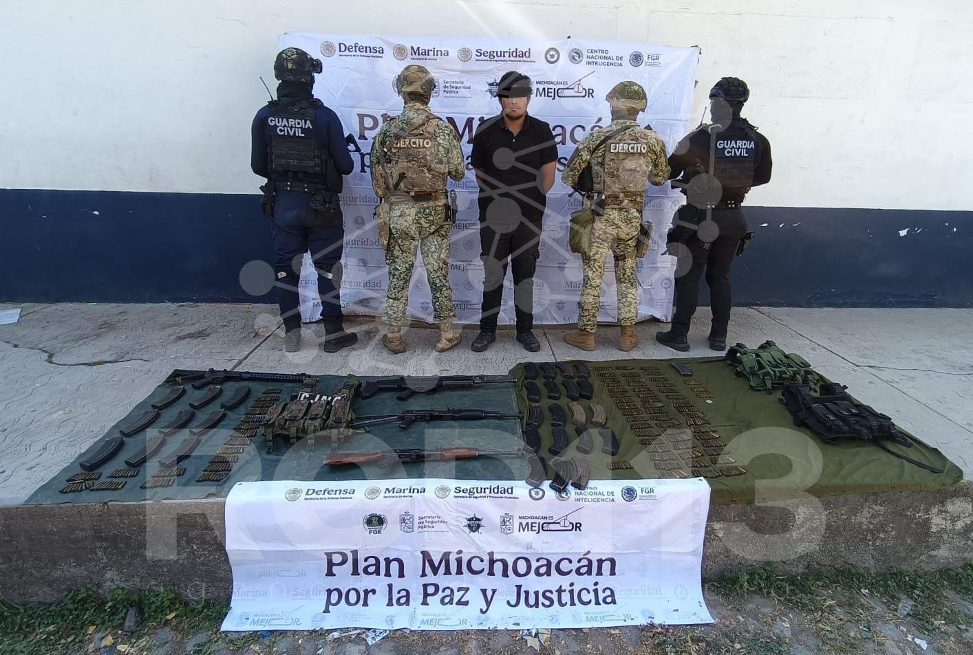 Apatzingán, Mich.- 19 de febrero de 2026.- Un sujeto conocido con el alias de “El Cochiloco, presunto integrante del Cartel Jalisco Nueva Generación, fue detenido por las fuerzas del orden en posesión de un arsenal y un vehículo con reporte de robo, en las inmediaciones de la población de Acahuato, en la periferia del municipio de Apatzingán.