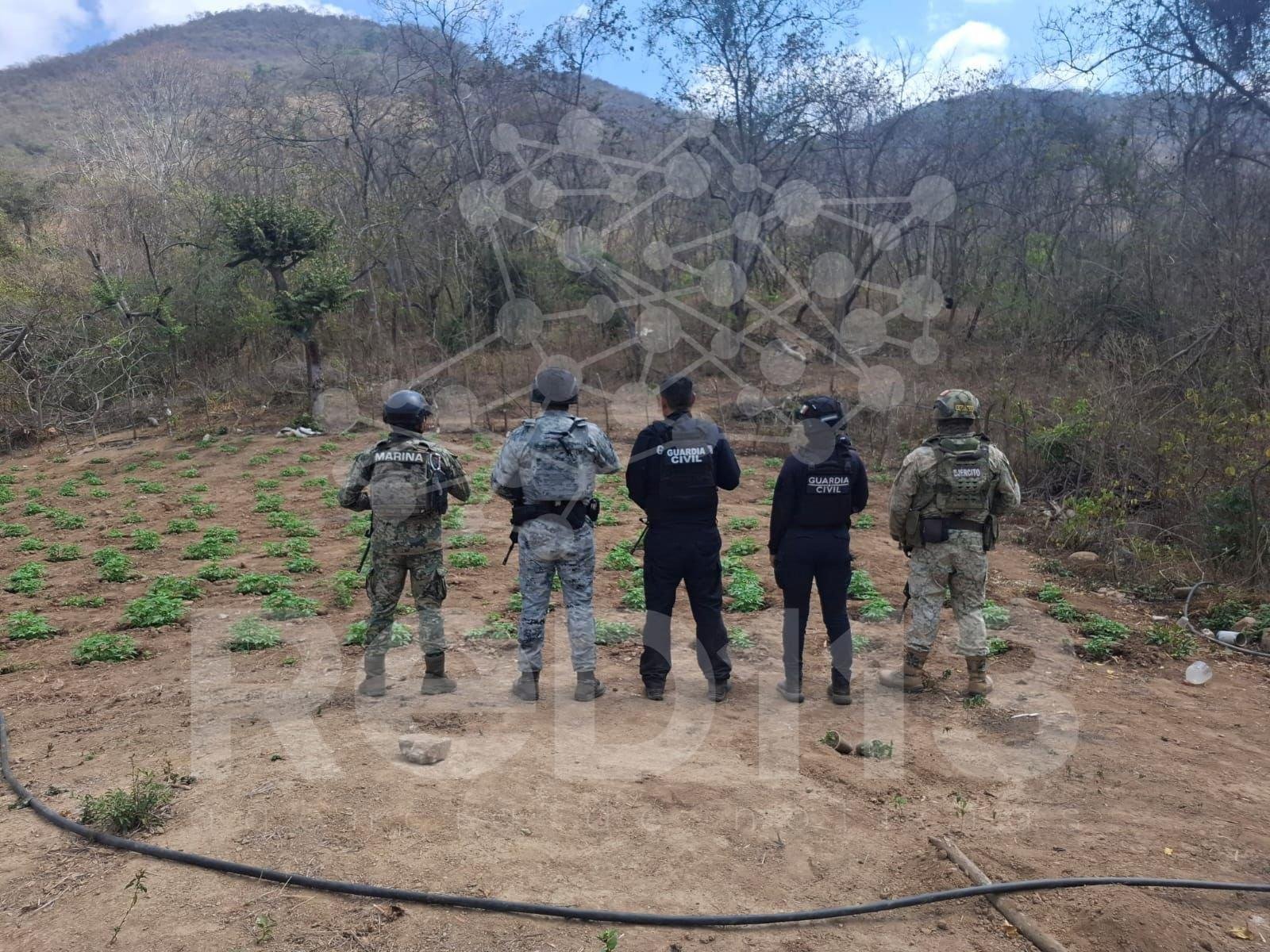 Arteaga, Michoacán, 11 de febrero de 2026.- Como parte de las acciones operativas del Plan Michoacán por la Paz y la Justicia, elementos de las secretarías de Seguridad Pública (SSP), de la Defensa Nacional (Defensa), de Marina (Marina) y la Guardia Nacional (GN) localizaron y destruyeron una plantación de marihuana en la localidad de Los Copales, perteneciente al municipio de Arteaga.
