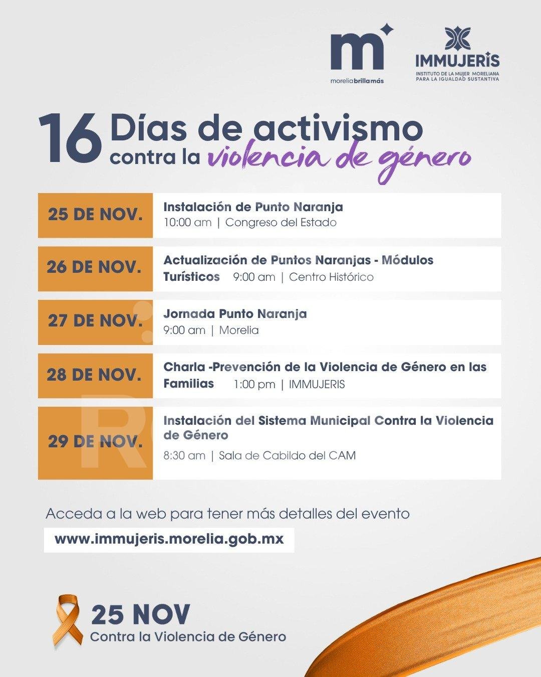 Morelia, Michoacán; 22 de noviembre de 2024.- Con el fin de sumar a la ciudadanía en la prevención y lucha contra la violencia de género, el Gobierno de Morelia a través del Instituto de la Mujer Moreliana para la Igualdad Sustantiva (IMMUJERIS) da a conocer las actividades que se realizarán durante los 16 días de activismo con motivo del 25 de noviembre, Día Internacional de la Eliminación de la Violencia contra la Mujer, programa que impulsa el Presidente Municipal Alfonso Martínez Alcázar.