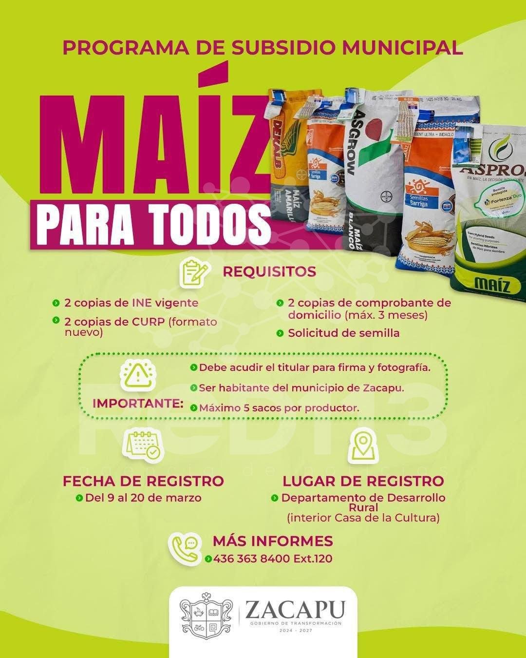 Para participar, las y los interesados deberán presentar dos copias de INE vigente, dos copias de CURP en formato nuevo, dos copias de comprobante de domicilio con una vigencia máxima de tres meses, así como la solicitud de semilla. Además, se informó que el titular deberá acudir personalmente para firma y fotografía, y que el apoyo contempla un máximo de cinco sacos por productor.