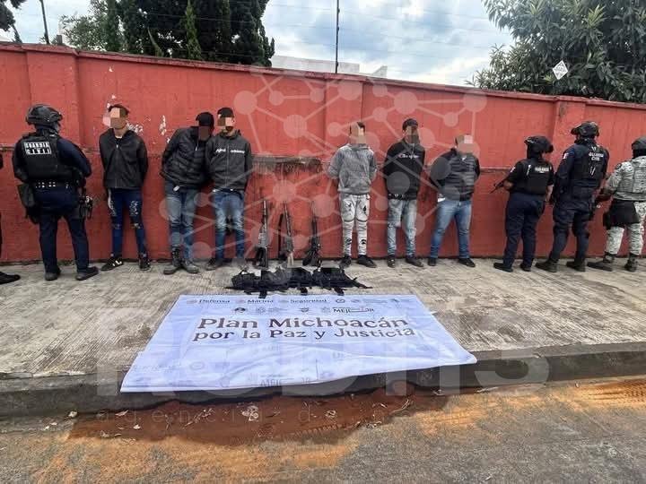 Trascendió que durante un despliegue operativo realizado esta mañana fueron capturados Carlos Iván G. E., de 33 años, Miguel Ángel P. O., de 40 años, Jorge Alberto V. H., de 35 años, Gerardo Antonio A. G., de 30 años de edad, originarios del estado de Jalisco, Hugo Daniel P. P., de 24 años, vecino de Uruapan y Marvin L. R., de 24 años de edad, este ultimo de nacionalidad venezolana.
