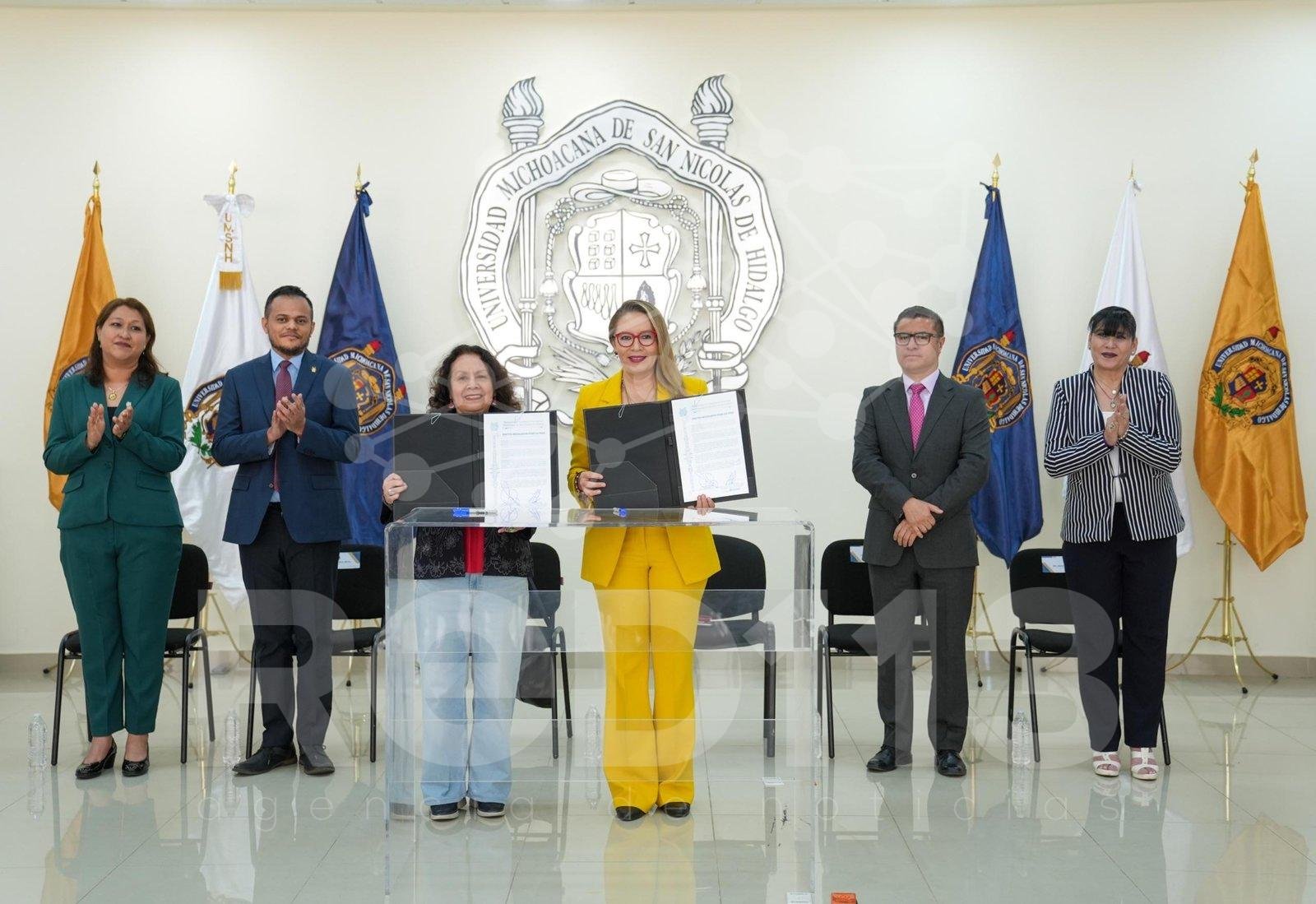 Morelia, Michoacán, a 27 de marzo de 2026.- El Pacto Nicolaita por la Paz fue signado por la rectora de la Universidad Michoacana de San Nicolás de Hidalgo (UMSNH), Yarabí Ávila González y por la directora general de Formación y Gestión Cultural de la Secretaría de Cultura del Gobierno de México, Lucina Jiménez López, así como por las Escuelas Incororadas, quienes desplegarán en conjunto una serie de acciones para institucionalizar la cultura de paz como una política pública universitaria.
