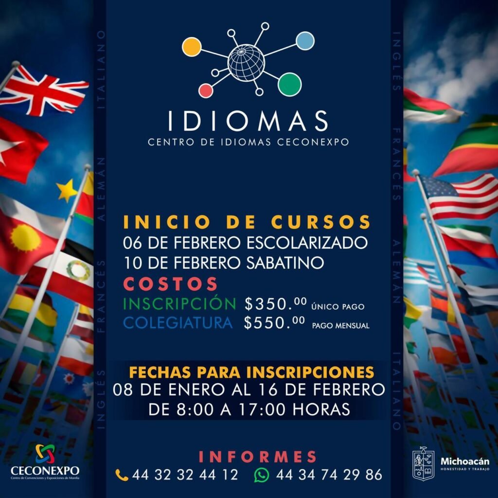 Morelia, Michoacán, 10 de enero de 2024.- El Centro de Idiomas del Centro de Convenciones de Morelia (Ceconexpo), inicia el periodo de inscripciones para los cursos de inglés, alemán, francés, italiano, chino y purépecha, mismo que se puede cursar en sistema escolarizado y sabatino. Las clases iniciarán los días 6 y 10 de febrero, respectivamente.