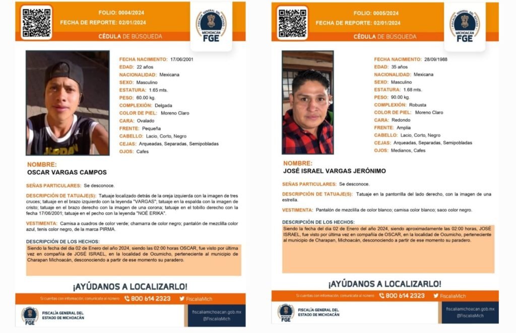 La Fiscalía General de Michoacán hace un llamado a la población para que, en caso de tener un dato que contribuya a la localización de José Israel Vargas Jerónimo y Oscar Vargas Campos, se comuniquen al 800 6142323.