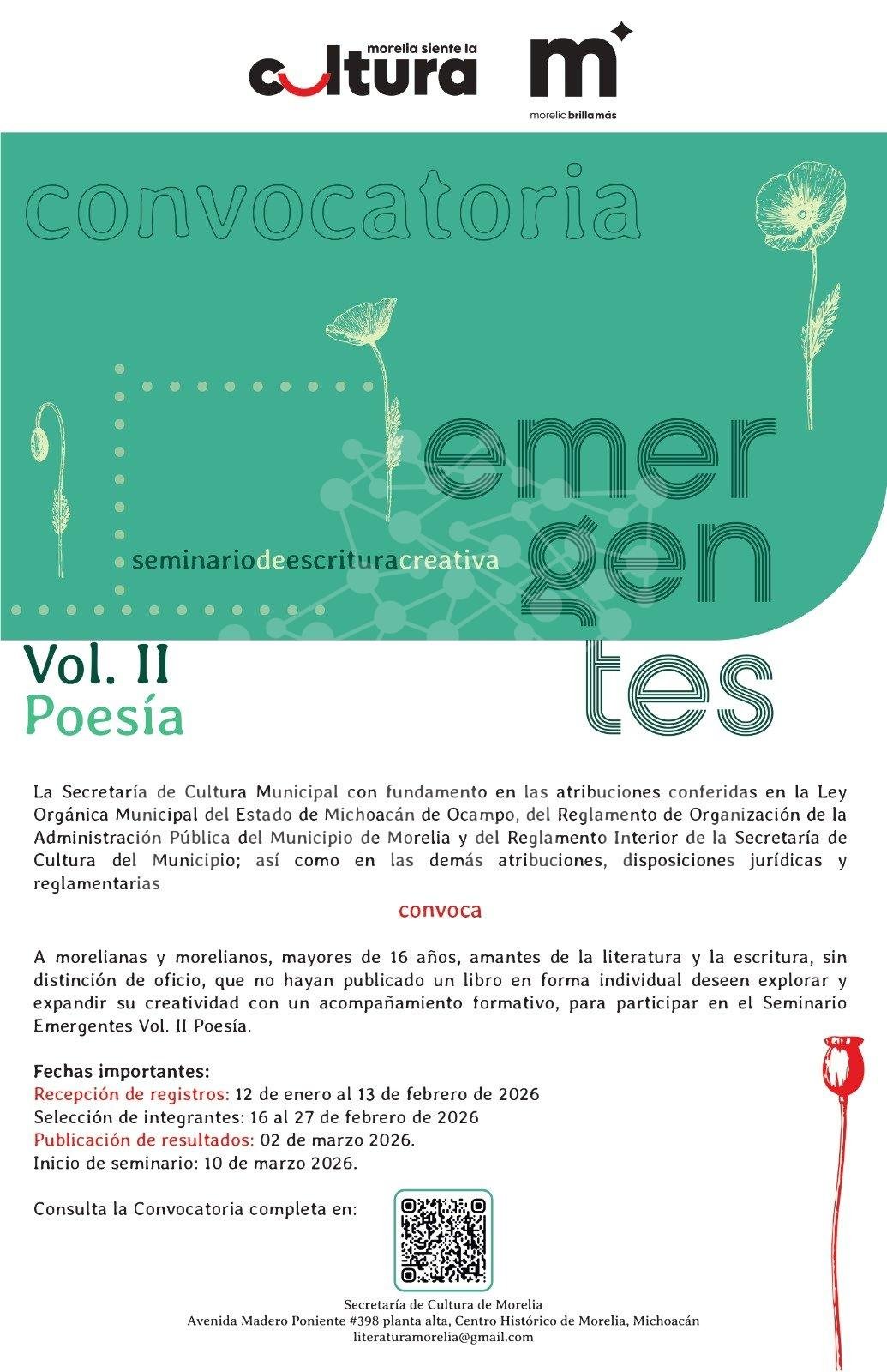 Morelia, Michoacán, a 13 de enero de 2026.- Con el objetivo de fortalecer la creación literaria local y dar continuidad a los procesos formativos impulsados desde el ámbito cultural, el Gobierno de Morelia, que encabeza el presidente municipal Alfonso Martínez Alcázar, por medio de la Secretaría de Cultura (SeCultura), convoca a poetas morelianas y morelianos a participar en el seminario “Emergentes Vol. II Poesía”.