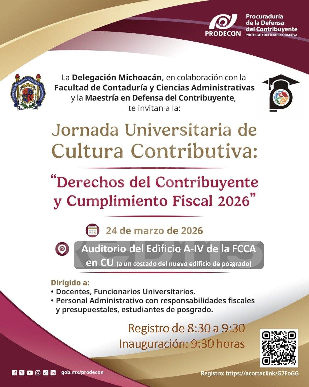 Morelia, Michoacán. – 23 de marzo de 2026.-La Procuraduría en Defensa del Contribuyente (PRODECON), a través de su Delegación Michoacán, a cargo de Francisco Javier García Heredia, en coordinación con la Facultad de Contaduría y Ciencias Administrativas (FCCA) de la UMSNH, llevará a cabo la “Jornada Universitaria de Cultura Contributiva”: Derechos del Contribuyente y Cumplimiento Fiscal 2026”, dirigida a la comunidad universitaria.